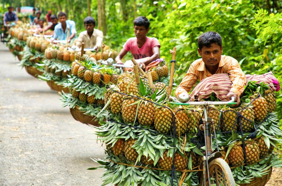 Zemědělci v Bangladéši dovedli umění rovnováhy k dokonalosti, když při přepravě ananasů na kole vyvažují až 120 kusů tropického ovoce – přestože bicykl s těžkým nákladem mohou pouze tlačit. Ananasy zaujímají v jihoasijské zemi třetí místo, co se týče produkce a obdělávané plochy. A přestože tamní ekonomika na zemědělství závisí a žluté plody se vyvážejí do zahraničí, včetně Evropy, farmáři za ně dostanou jen minimální částku. (foto: Profimedia)