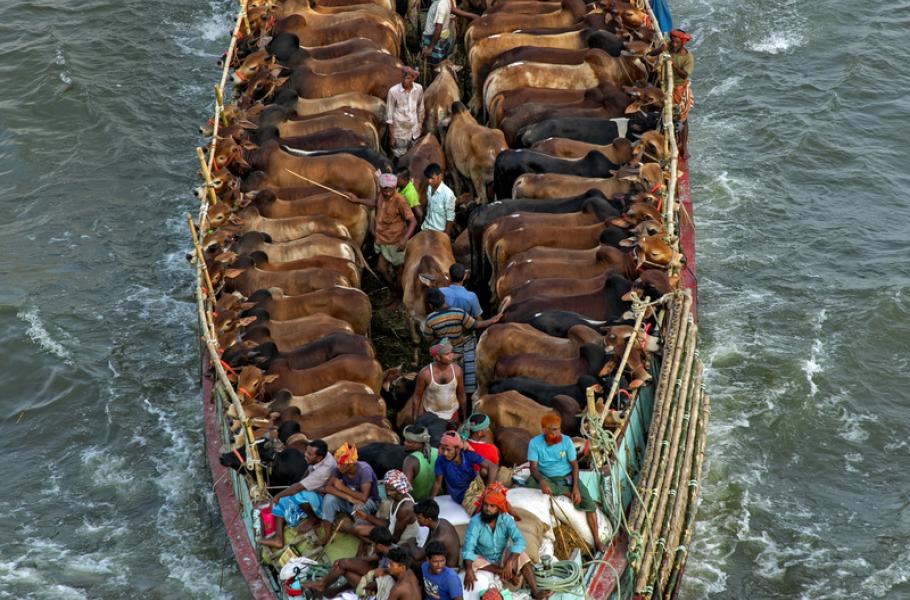 Desítky kusů skotu přepravují zemědělci na úzkých člunech na trhy, jež se nezřídka konají až 300 kilometrů daleko. Na dlouhých cestách mezi Indií a Bangladéšem tak řada zvířat zemře. Krávy se chovají na maso a jejich kůže se využívá v obuvnickém průmyslu, který v obou zemích vzkvétá. V muslimském Bangladéši navíc porážky dobytka nevyvolávají takovou kontroverzi jako v sousední hinduistické Indii. (foto: Profimedia)