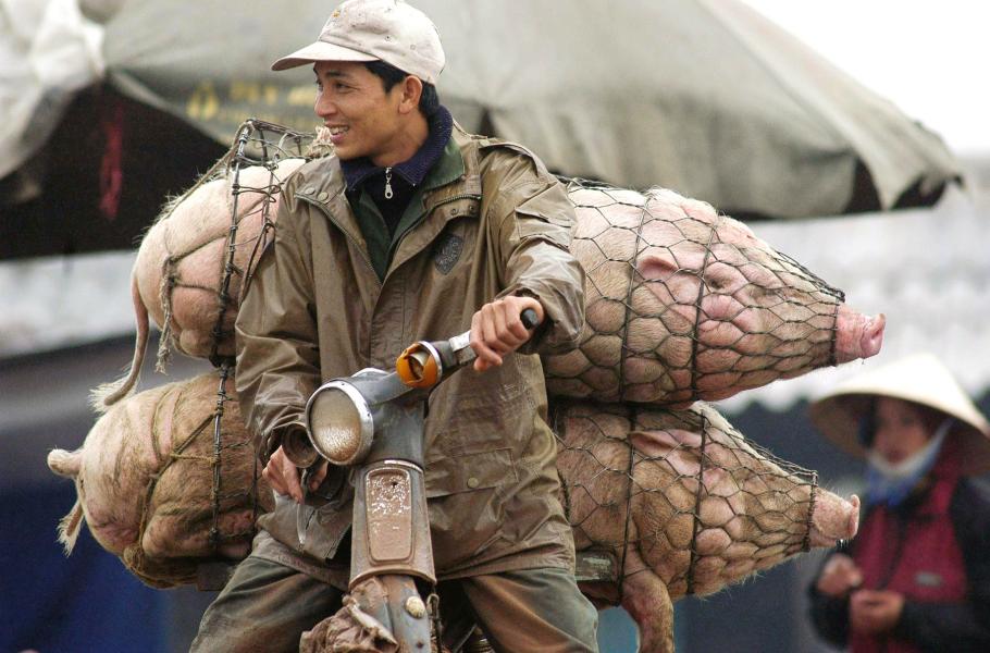 Chov prasat má ve Vietnamu tisíciletou tradici a ze všech druhů masa je vepřové na talířích Vietnamců zastoupeno nejvíc. Jak ovšem zvířata z farmy co nejjednodušeji a nejrychleji dostat na tržnici? Proplétat se s nimi pěšky po přeplněných ulicích není žádná hračka, proto farmáři vymysleli drátěný „zlepšovák“. V evropských ochráncích vzbudí nejspíš podobné klece hluboký odpor, na lokálních trzích jde však o běžnou praxi. (foto: Profimedia)