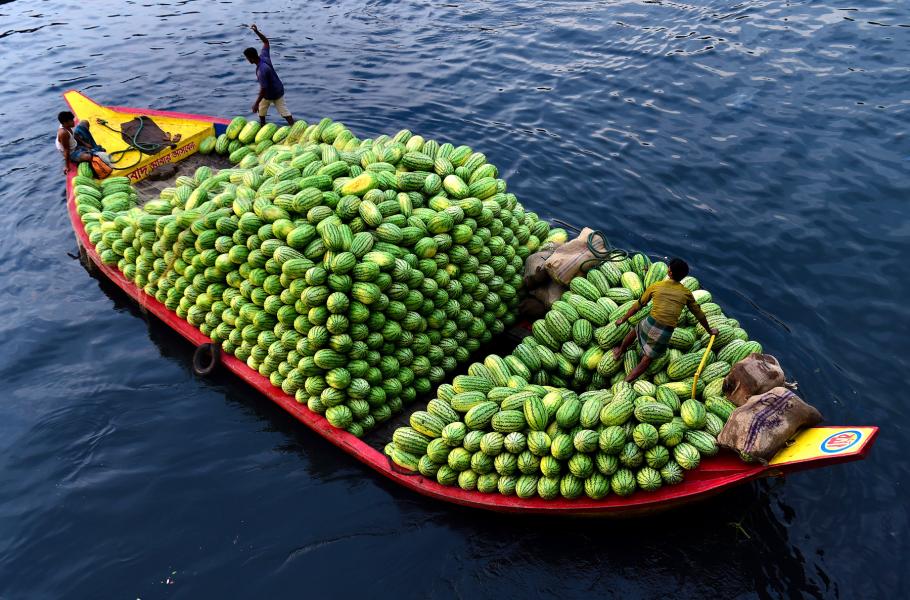 Bangladéšští pěstitelé se snaží přepravit co nejvíc ovoce a zeleniny naráz, aby ušetřili čas, potažmo peníze. Jediná zásilka proto nezřídka zahrnuje až 600 kilogramů plodin, jenže s podobným nákladem se velmi obtížně manipuluje. Ovoce se tudíž snadno poškodí a výjimkou není ani potopení plavidla, které zátěž nezvládne. Ročně se tak vyplýtvají tisíce kilogramů potravin. (foto: Profimedia)