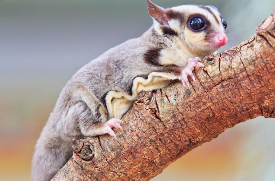 Jeden z novoguinejských vačnatců – vakoveverka létavá (Petaurus breviceps). Drobný živočich žije výhradně na stromech a na kratší vzdálenosti dokáže i létat. Mezi předními a zadními končetinami má totiž blány volné kůže, které dokáže při skoku ze stromu na strom napnout a plachtit na vzdálenost padesáti i více metrů.