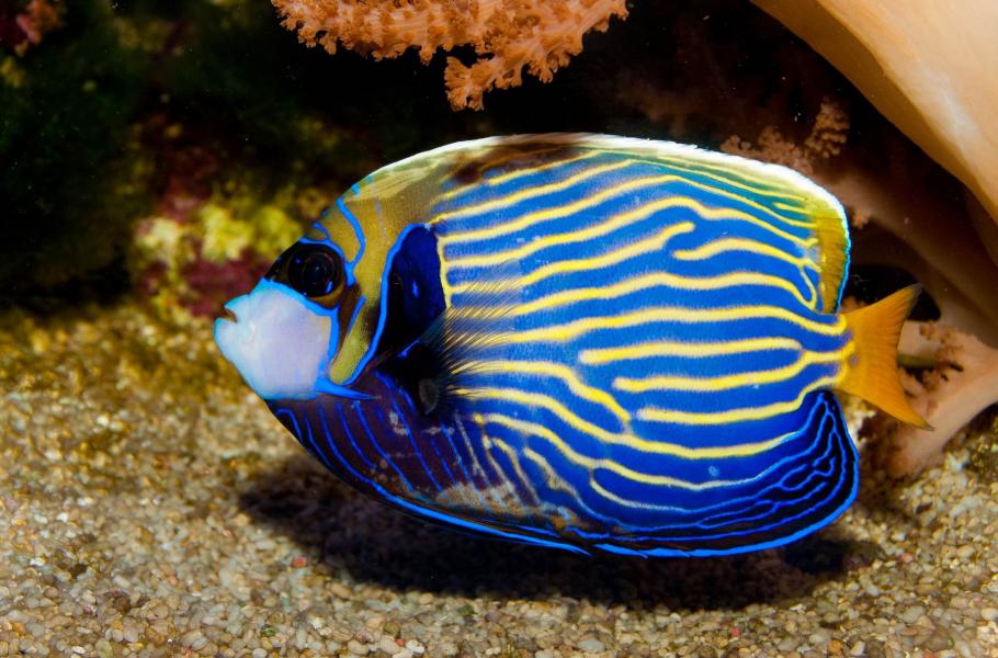 Pomec císařský (Pomacanthus imperator), jedna z korálových rybek, která nesnese přítomnost jedince stejného druhu. Důsledkem vyzývavého zbarvení jsou nemilosrdné boje na život a na smrt. (foto: Shutterstock)