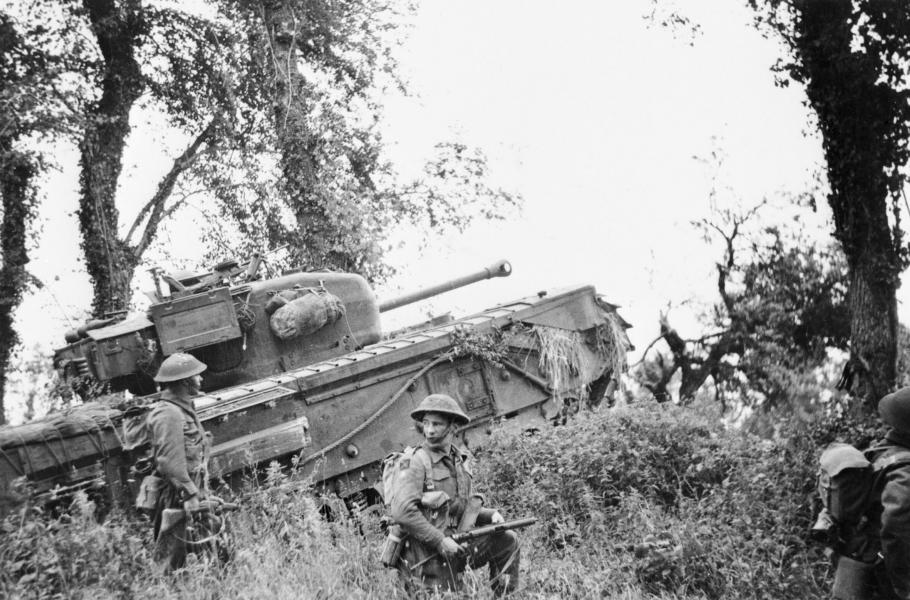 Tanky Churchill 31. tankové brigády a skotská pěchota v typickém prostředí normandských „bocage“ během operace Epsom.