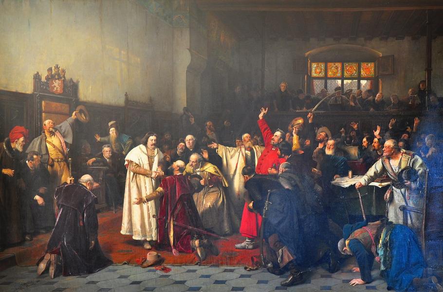 Volba Jiřího z Poděbrad českým králem. (ilustrace: Wikimedia Commons, Václav Brožík, PDM 1.0)