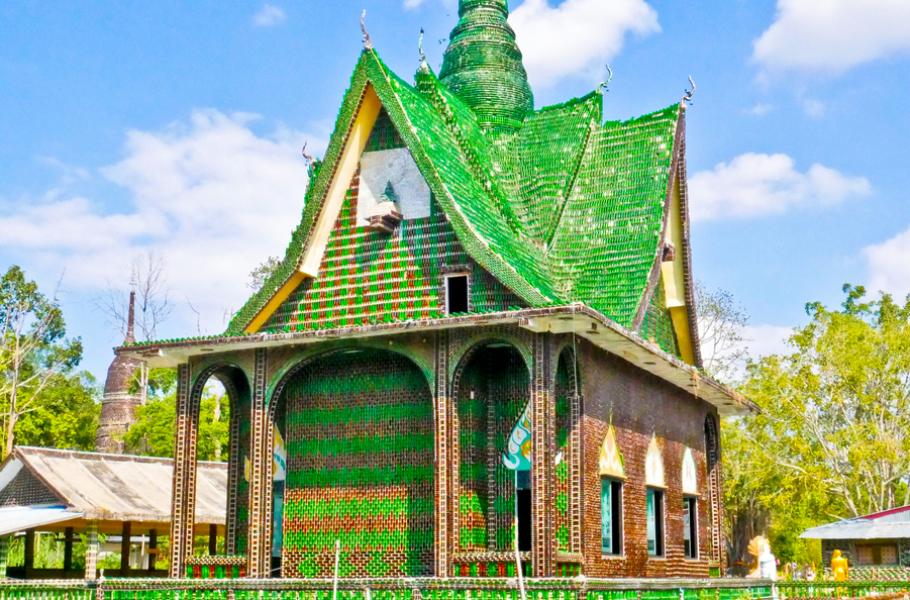 Na rozdíl od plastových lahví se z jejich skleněných protějšků nevyrábí recyklát, ale používají se v celku. Odřezává se jim však hrdlo, aby se daly postavit na sebe, načež se spojují maltou, stejně jako cihly. Ani v tomto případě nejde o převratnou novinku, protože nejstarší dochovaný dům ze skla vznikl již roku 1905: Zlatokopové v Nevadě na něj použili asi padesát tisíc sklenic. V Thajsku pak z recyklovaného skla postavili rovnou svatostánek – Wat Pa Maha Chedi Kaew neboli „chrám milionů lahví“ vyrůstal od roku 1984. (foto: Shutterstock)