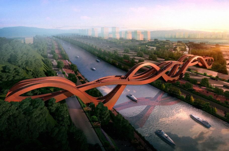 Přestože jeho název zní jako spojení několika „béčkových“ filmů, hlavní inspirace 185 metrů dlouhého mostu pochází z tradičních čínských dekorativních uzlů. Ve středu se stavba rozdvojuje a díky výškovým rozdílům vyplývajícím z vlnitého tvaru nabízí nádherný výhled na přilehlé jezero Mej-si. (foto: NEXT Architects)