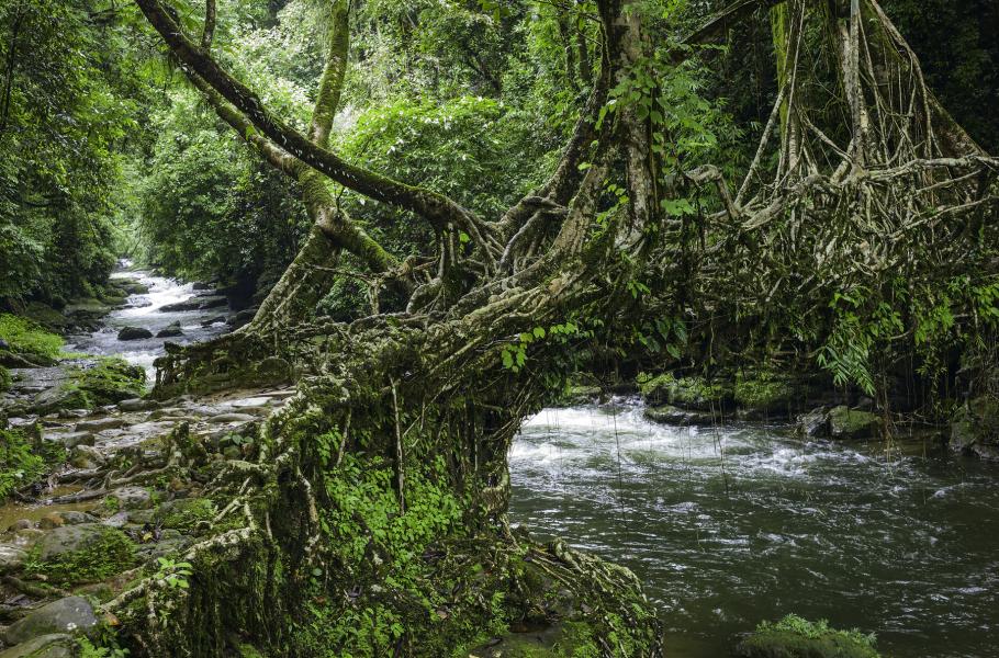 Město Čérápuňdží patří k nejvlhčím místům v Indii i na Zemi a mimo jiné se tam daří gumovníku. Příslušníci kmene War-Khasi si všimli, že vedle klasických podzemních kořenů má zmíněná dřevina i pevné nadpovrchové kořeny, a napadlo je „vypěstovat si“ z nich most. Výhonky domorodci usměrňují s využitím dutých kmenů – jakmile jsou pak dostatečně dlouhé, nechají se zarůst do země. Trvá zhruba patnáct let, než lávka zmohutní natolik, aby unesla až padesát lidí naráz. (foto: Shutterstock)
