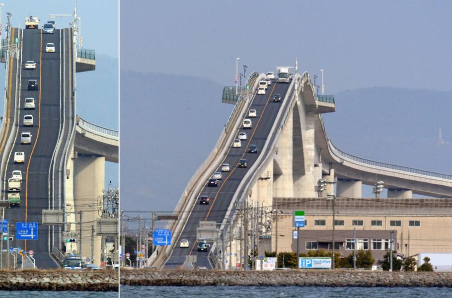 Most spojující japonská města Macue a Sakaiminato připomíná na první pohled obří horskou dráhu pro auta. Aby pod ním mohly proplouvat rybářské lodě, šplhá jeho konstrukce až do výšky 44 metrů. Oba jeho konce pak zdánlivě stoupají a klesají jako noční můra každého řidiče. Ve skutečnosti jde pouze o zkreslení na fotografiích – nájezdové i sjezdové části mají sklon 6,1 % na jedné straně a 5,1 % na druhé. Žádný drastický „sešup“ vás tedy nečeká. (foto Profimedia)