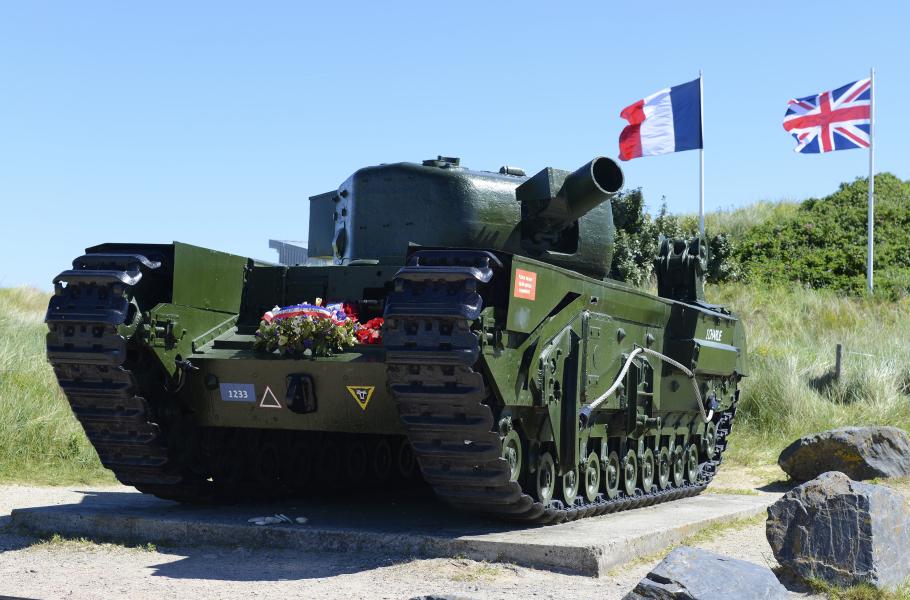 Tank Churchill Mk.IV Avre vyřazený během dne D, jenž dnes slouží jako památník v Normandii.
