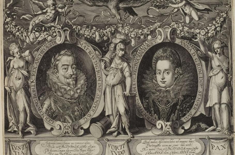 Anna Tyrolská s manželem císařem Matyášem. Vezhledem k tomu, že jejich manželství bylo bezdětné, bylo následnictví na základě tzv. Oňatovy smlouvy určeno Ferdinandovi II. ze štýrské větve Habsburků.