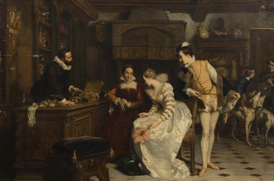 Parfumér Kateřiny Medicejské prodává otrávené rukavice. (ilustrace: Wikimedia Commons, Pierre Charles Comte, PDM 1.0)