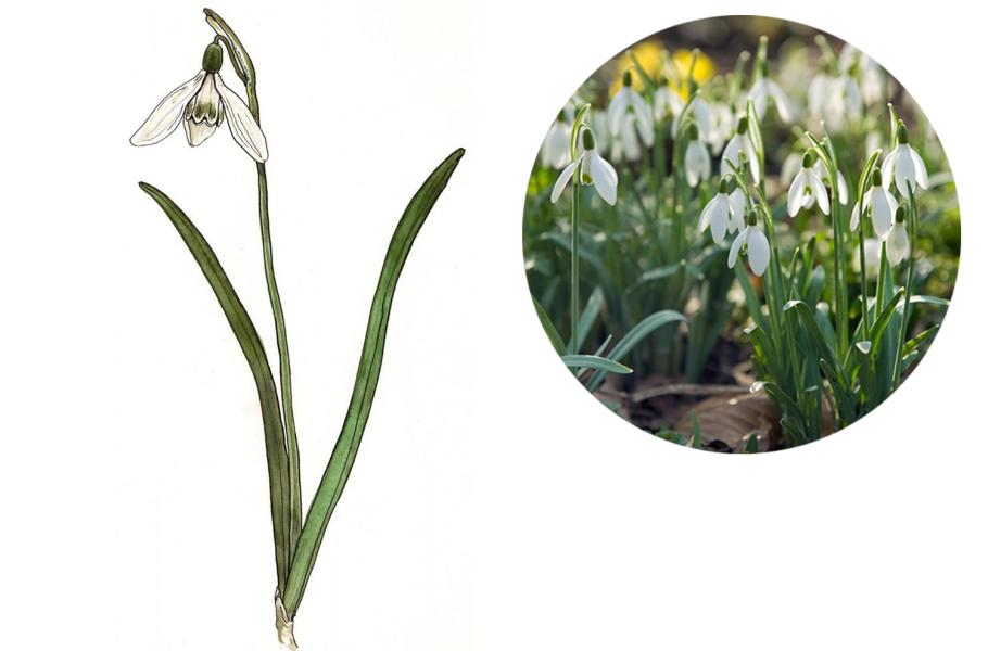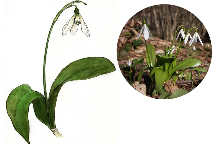 Sněženka podsněžník (Galanthus nivalis). Její životní cyklus je krátký – dříve než vyroste listí na stromech a vysoké byliny (především kopřivy) v podrostu, listy se v květnu zatáhnou a rostliny přežívají v cibulích až do dalšího jara