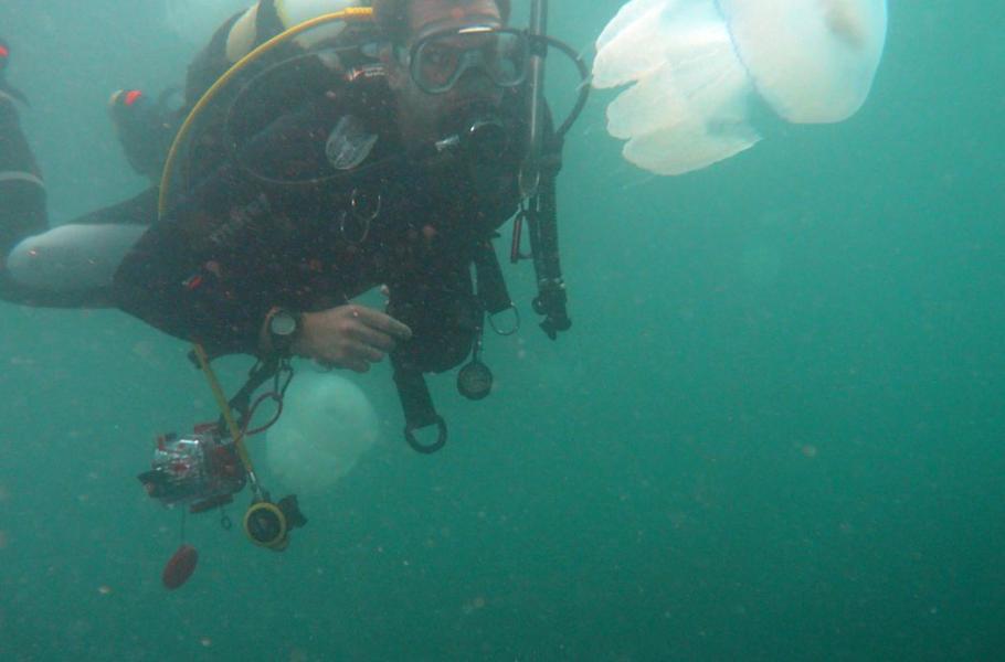 Potápění v „medúzové polívce“, mezi množství různých druhů medúz, z nichž některé dosahovaly velikosti našich hlav.
