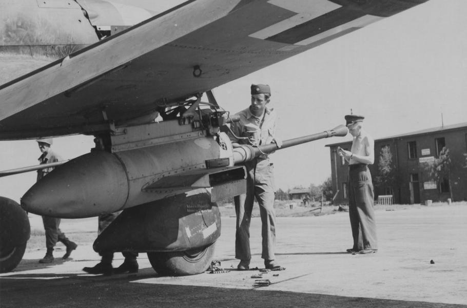 Američtí vojáci zkoumají 3,7mm protitankový kanon na německé stuce, letiště v Plzni 1945. (foto: Wikimedia Commons, U.S. Air Force, CC0)