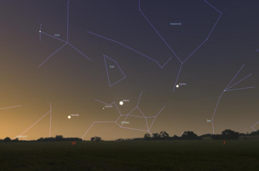 Jak už asi tušíte, jedná se o objekty z říše planet. Nejvýš nad horizontem a také nejvíc nad jihem zahlédnete žlutobílý Jupiter v souhvězdí Hadonoše. Vydáte-li se doleva a níž k obzoru, narazíte nejdřív na nažloutlý Saturn ve Střelci a posléze i na blyštivou Venuši na pomezí Střelce a Kozoroha. Poloha Měsíce se bude měnit s každým dnem: 1. března jej uvidíte mezi Jupiterem a Saturnem, 2. března mezi Saturnem a Venuší a konečně 3. března mezi Venuší a jihovýchodním horizontem. Pro úplnost dodejme, že napravo od krále planet bude na obloze patrná i jasná stálice Antares ze souhvězdí Štíra.