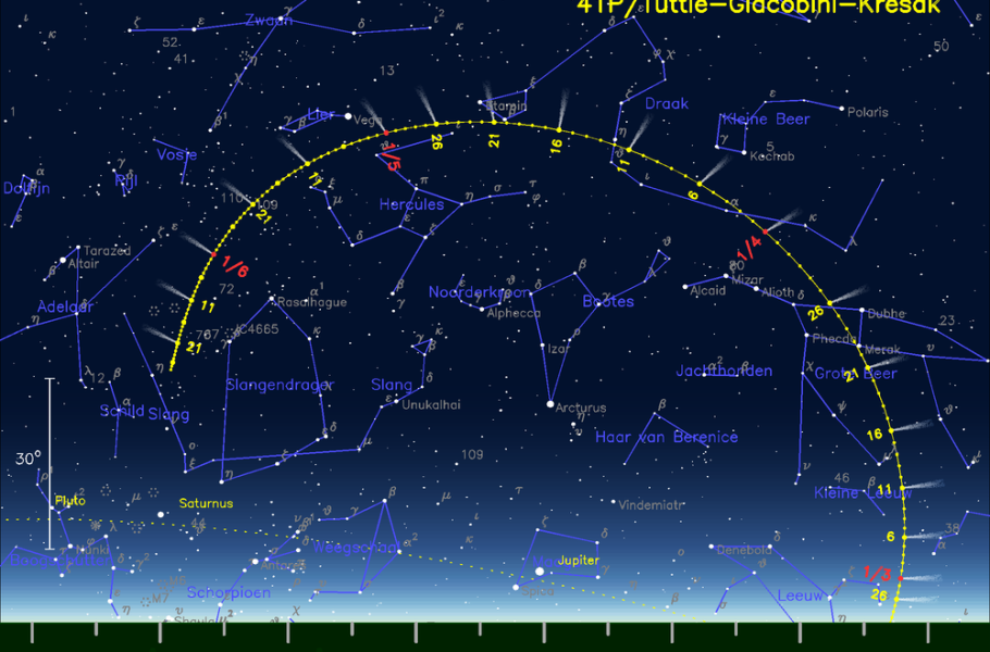 V posledním březnovém týdnu začne být lépe pozorovatelná krátkoperiodická kometa 41P/Tuttle-Giacobini-Kresák, pro kterou jsou charakteristická nenadálá a výrazná, i když poměrně krátká zjasnění. Na noční obloze ji nalezneme na rozhraní souhvězdí Velké medvědice a Draka. Od 12. března se stane při pozorování z území ČR cirkumpolární, nebude vůbec zapadat.V tomto období dosáhne její jasnost asi 6,5 mag, přičemž nejlepší pozorovací podmínky nastanou na počátku dubna, kdy kometa možná zjasní až na 6 mag.