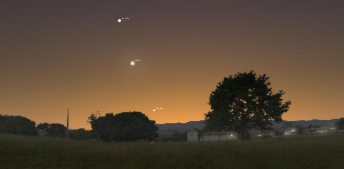 Seskupení úzkého měsíčního srpku, Jupitera a Venuše 23. března na večerní obloze nad západem. (foto: Stellarium, CC0)