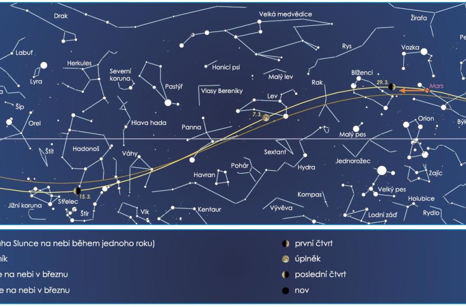 V uvedené době se k Jupiteru připojí i nepříliš nápadný Merkur, a 28. března dokonce nastane jejich konjunkce, kdy je bude dělit asi jen 1,5°. Stane se tak ovšem na jasné soumrakové obloze, navíc těsně nad západním horizontem. O necelý den dřív se však odehraje ještě jedno nebeské setkání: Měsíc spějící do první čtvrti doputuje do blízkosti Marsu coby poslední jasné planety březnové noční oblohy, zvolna se sunoucí napříč souhvězdím Býka. Nejblíž, konkrétně zhruba 2,5°, si budou 28. března brzy ráno – krátce před tím, než zapadnou za severozápadní obzor.