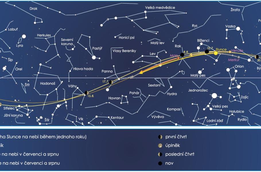 V první polovině měsíce se Slunce nachází ve znamení Raka, 22. července v 16:27 SELČ vstoupí do znamení Lva.