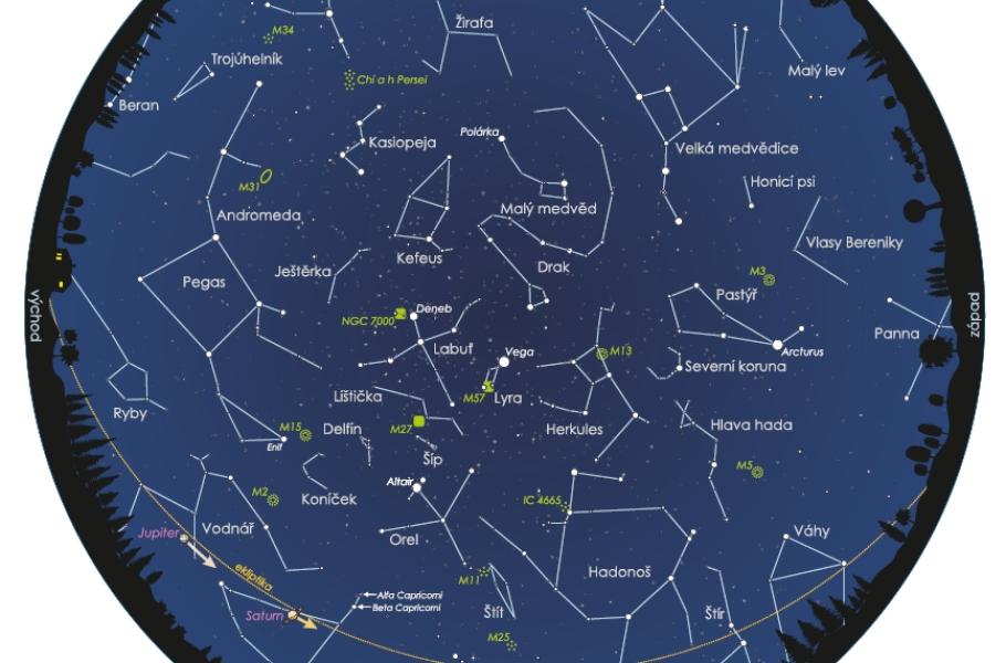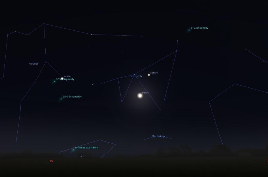 Z dalších nápadných planet rozhodně neopomeňte Saturn s Jupiterem. První jmenovaný se bude nacházet v souhvězdí Kozoroha, druhý v sousedním Vodnáři. V uvedeném pořadí se budou po celé prázdniny nořit zpoza jihovýchodního obzoru asi hodinu před půlnocí.