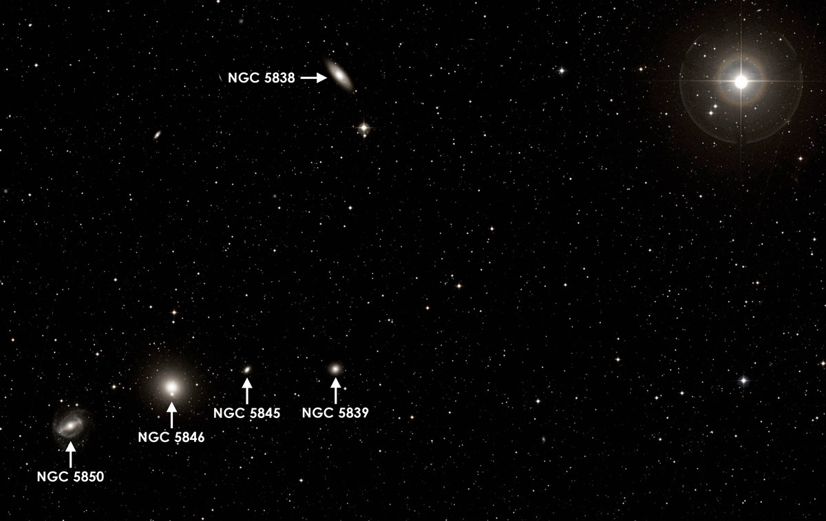 Kolik toho uvidíte, záleží na pozorovacích podmínkách i průměru objektivu vašeho dalekohledu. V dané části nebe, tedy 1° jihovýchodně od 110 Virginis, se totiž rozkládá čtveřice různě jasných galaxií. Na obloze se rozprostírají přibližně od východu na západ a dělí je rozestupy okolo 8′–10′. Dohromady tak okupují úsek nebe o průměru zhruba 0,5°. Nejvýchodněji leží NGC 5850 s 10,8 mag, za níž následuje NGC 5846 s 10 mag, NGC 5845 s 12,5 mag a NGC 5839 s 12,7 mag. Nejnápadnější NGC 5846 byste měli zahlédnout již v dalekohledu s objektivem o průměru okolo 100 mm, ovšem jen jako 1,5′ velkou nezřetelnou difuzní plošku s náznakem bodového jádra. Větší přístroj víc podrobností nepřidá, galaxii v něm však spatříte mnohem snáz a mírně narostou i její úhlové rozměry.