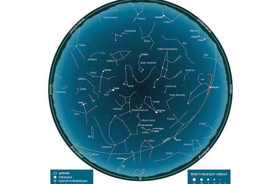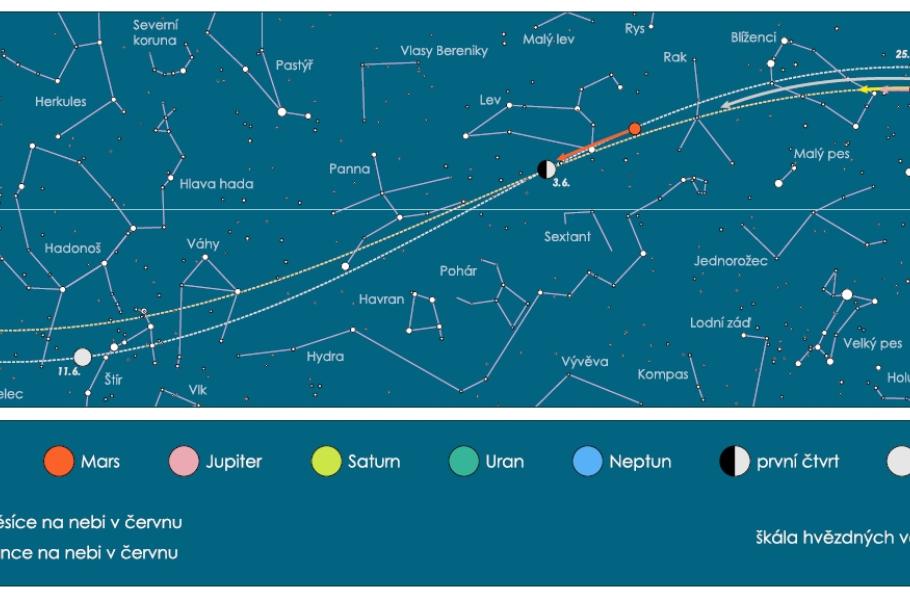 Večerní oblohu na počátku června, ale i v jeho závěru ozdobí blízké setkání tří různorodých nebeských těles: dorůstajícího Měsíce, oranžového Marsu a jasné hvězdy Regulus. Poslední zmíněná napovídá, že k sérii pohledných konjunkcí dojde v souhvězdí Lva (viz přehled zajímavých úkazů). K Marsu s Regulem se však zkuste vracet průběžně – jen tak totiž postřehnete, s jakou vervou bude rudá planeta na nebi směřovat vstříc zářivému „srdci Lva“. Nejblíž se tělesa ocitnou 17. června večer, kdy je bude dělit asi 0,7° a Mars se bude nacházet takřka přímo nad Regulem. Poté se jejich cesty opět rozejdou.