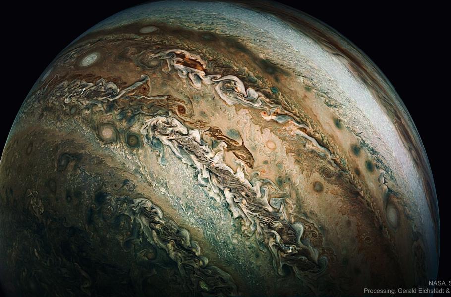 Na fotografiích z velkých dalekohledů či kosmických sond hýří Jupiter pestrou směsicí barev. Stojí za nimi zřejmě interakce původně bezbarvých zrnek hydrogensulfidu amonného (nachází se v oblacích) s kosmickým zářením při velmi nízkých teplotách.