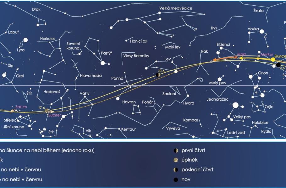 Můžete třeba pátrat po Merkuru, jehož viditelnost se bude až do poloviny června zlepšovat. Zrak zaměřte nízko nad severozápadní obzor a s pozorováním začněte asi 20–30 minut poté, co Slunce zmizí ze scény. Chcete-li výrazně zvýšit šanci, že planetu zahlédnete, vezměte si na pomoc dalekohled s velkým zorným polem. Hledejte zářící bod mihotající se oproti soumrakovému nebi. Jen o něco později, až obloha dostatečně potemní, můžete zkusit rozeznat i naoranžovělý Mars v souhvězdí Blíženců. Zatímco na počátku června jej spatříte v úhlové vzdálenosti cca 16° od Merkuru (po levé straně a o něco výš nad obzorem), 18. června už půjde pouze o 0,2° a rudá planeta se bude nacházet přímo pod Merkurem. Pozorování v uvedeném období však značně zkomplikuje malá výška obou těles nad horizontem i světlé podvečerní nebe.