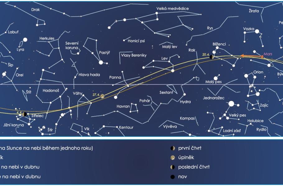 V dubnu budeme mít dobrý výhled nejen na opomíjené souhvězdí. Po čtvrt roce se nám opět naskytne příležitost prohlédnout si všechny planety viditelné pouhýma očima. Na konci dubna bude k vidění superúplněk – pro pozorovatele v Česku bude úplňkový Měsíc nejblíž Zemi v roce 2021