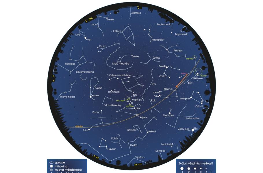 První snadno pozorovatelnou oběžnicí dubnového hvězdného nebe se stane Mars, který se objeví s nástupem noci v souhvězdí Býka vysoko nad západem. Co myslíte, zaslouží si přízvisko „rudá planeta“? A pokud ano, jakým odstínem byste popsali podobně zbarvené jasné stálice v jeho okolí – tedy Aldebaran z Býka zářící přímo pod ním a Betelgeuze z Oriona nalevo? Půjde spíš o pomerančovou, nebo snad broskvovou?