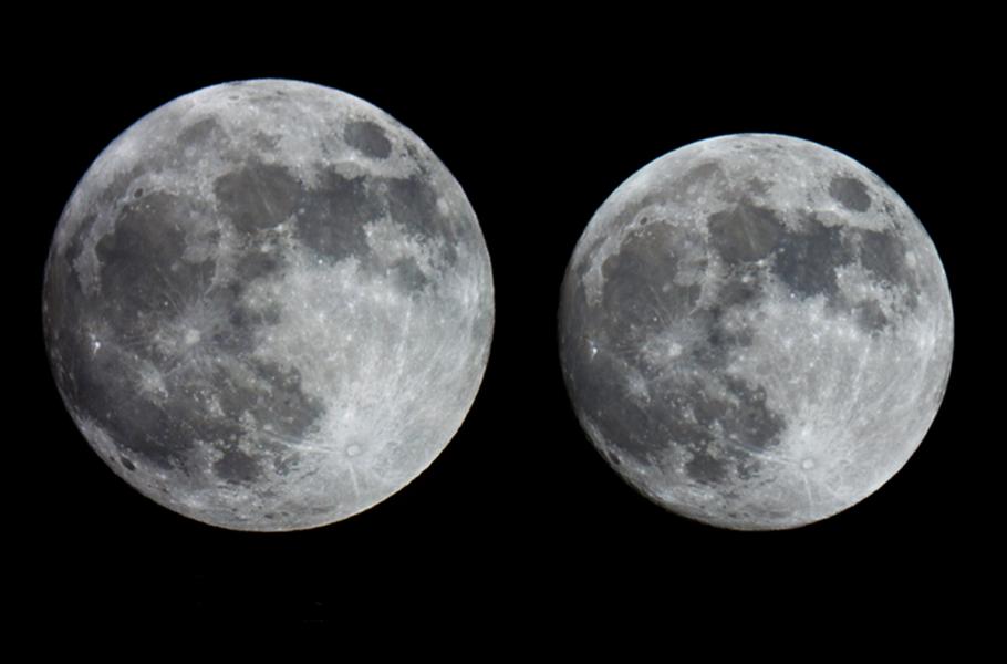 Srovnání průměru superměsíce z 5. května 2012 (vlevo) a mikroúplňku z 28. listopadu 2012 (vpravo). Rozdíl ve vzdálenosti Měsíce od Země je zhruba 50 300 kilometrů, což „superúplněk“ činí o asi 14 procent větší a 30 procent jasnější než „mikroúplněk“. (foto: Catalin Paduraru, apod.nasa.gov)