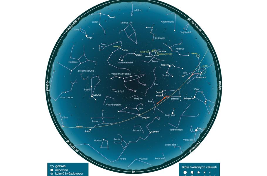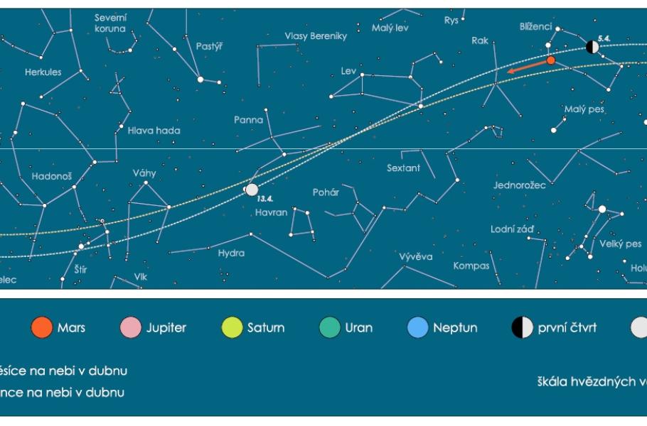 Oproti předchozímu měsíci se odehrála i jedna výrazná změna – večerní obloha přišla o svou dominantu v podobě zářivé večernice Venuše. Ta totiž na sklonku března dospěla na nebi do blízkosti Slunce a 23. března se kolem něj prosmýkla na ranní oblohu. Proměnila se tak v jitřenku a zůstane jí až do listopadu. V dubnu planetu spatříte zatím jen nízko nad východním horizontem, určitě ji však nepřehlédnete, protože již 27. dubna dosáhne její jasnost druhého letošního maxima a vyšplhá až na −4,5 mag.