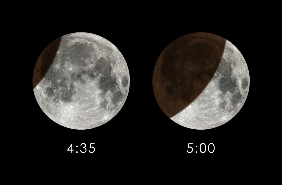 Formálně úkaz odstartuje ve 3:32 SELČ polostínovým zatměním, očima stěží postřehnutelným. Již o necelou hodinu později, ve 4:27, ovšem započne mnohem atraktivnější částečné zatmění a plný zemský stín se bude na měsíční kotouč nasouvat zleva. S nástupem úplného zatmění v 5:29 však bude Měsíc bohužel již přibližně čtvrt hodiny pod obzorem… Pro tuzemské pozorovatele tak plný zemský stín obsáhne jen dvě třetiny jeho disku.