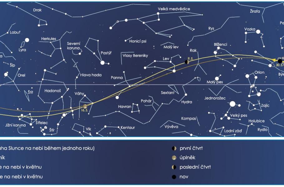 V první polovině měsíce se Slunce nachází ve znamení Býka, 21. května ve 3:23 SELČ vstupuje Slunce do znamení Blíženců.