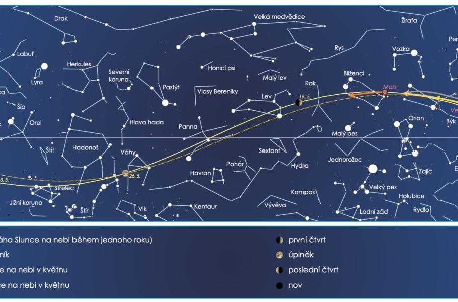 Poslední jasnou planetu květnového nebe musíme hledat v Blížencích, tedy na večerní obloze a vysoko nad západem: Naoranžovělý Mars v průběhu 31 dní protne nebeská dvojčata od západu na východ, mezi 15. a 16. květnem navíc za přispění dorůstajícího srpku Měsíce. O pouhé tři dny později doputuje zemský průvodce – již v první čtvrti – na obloze k Regulu, který je s 1,4 mag nejjasnější stálicí souhvězdí Lva.