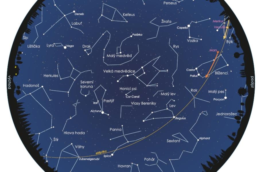 Na pozadí světlé oblohy však můžeme v květnu pozorovat i další planetární pár. Tentokrát ovšem půjde o soumrakové nebe velmi nízko nad severozápadem, kde se po západu Slunce krátce zjeví Venuše s Merkurem. Na začátku měsíce se bude jasnější Venuše s −3,9 mag nacházet blíž u obzoru, zatímco méně výrazný Merkur s −1 mag spatříme zhruba 5° nad ní. V popsaném uspořádání se bude dvojice až do předposledního květnového týdne společným tempem vzdalovat od Slunce, ve dnech 13. a 14. května navíc za doprovodu uzounkého měsíčního srpku. Poté však Merkur zpomalí a Venuše se k němu začne rychle přibližovat. K jejich nejtěsnějšímu setkání na nebi dojde 28. května, kdy je bude dělit cca 0,5°.