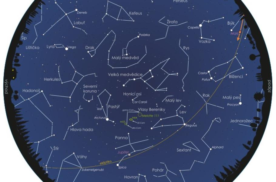 Napříč nocí spatříme i několik jasných planet. U první z nich bychom však neměli otálet: Zapadá totiž již krátce po setmění. Nalezneme ji nízko nad západním horizontem v souhvězdí Býka a prozradí ji výrazné naoranžovělé zabarvení. Už tušíte? Samozřejmě se jedná o Mars! A dál už to půjde pěkně popořádku: Následuje totiž žlutobílý Jupiter okupující souhvězdí Panny, který na obloze setrvá takřka celou noc a zapadne až nad ránem. Nedlouho po půlnoci se pak na pomezí Hadonoše a Střelce objeví nad jihovýchodním obzorem i nažloutlý Saturn. K ránu potom uděláme mohutný skok zpět a z vnějších partií světa planet se přeneseme na jeho počátek – to když se za rozbřesku nad východní horizont vyhoupne zářivá Venuše.