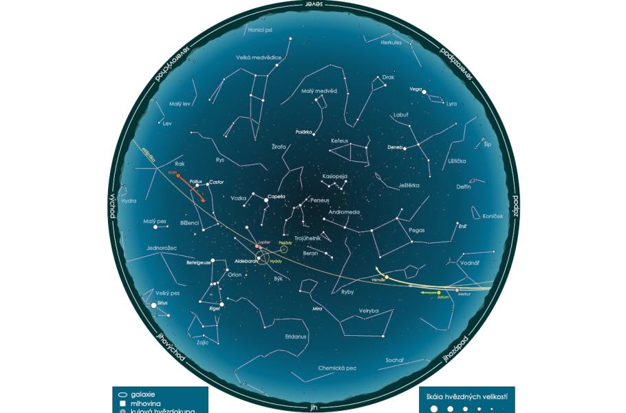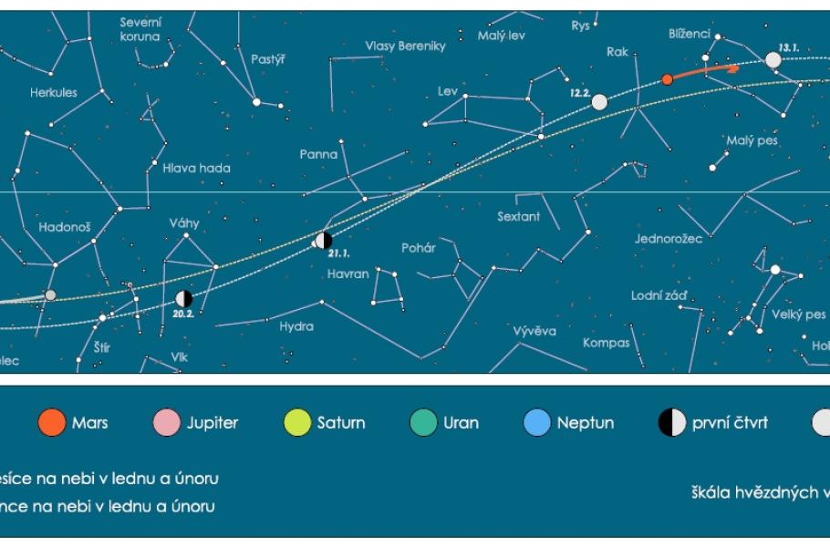 Noční nebe a počátku roku rozhodně nenabídne jen hvězdy. Zejména v první půlce noci se na něm totiž objeví i několik nápadných planet. Večer na sebe strhne pozornost zářivá Venuše nad jihozápadem. Budete-li ji sledovat alespoň několik dní, zjistíte, že se rychle vzdaluje od horizontu a přes souhvězdí Vodnáře míří do sousedních Ryb; ocitne se v nich 23. ledna a setrvá tam i po celý únor. Na své cestě hvězdnou oblohou se potká se Saturnem, další planetou usazenou ve Vodnáři. Nejblíž se k sobě dostanou 19. ledna, kdy je bude dělit úhlová vzdálenost 2,3°.