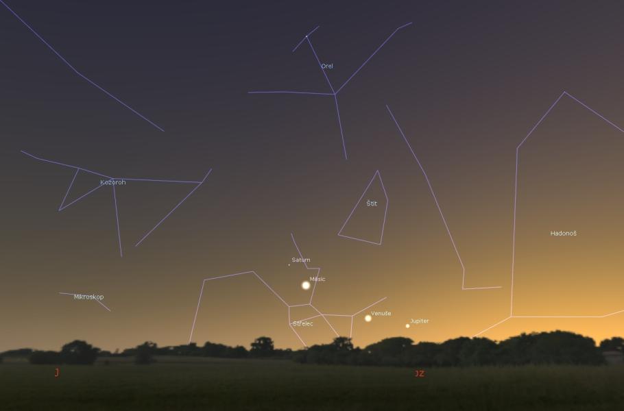 Začněte třeba na podvečerní a ještě světlé soumrakové obloze nízko nad jihozápadem, kde narazíte na žlutobílého Jupitera v souhvězdí Hadonoše. S nástupem noci se plynný obr sice skryje za obzor, na nebi se však objeví jeho planetární dvojče Saturn v sousedním Střelci.
