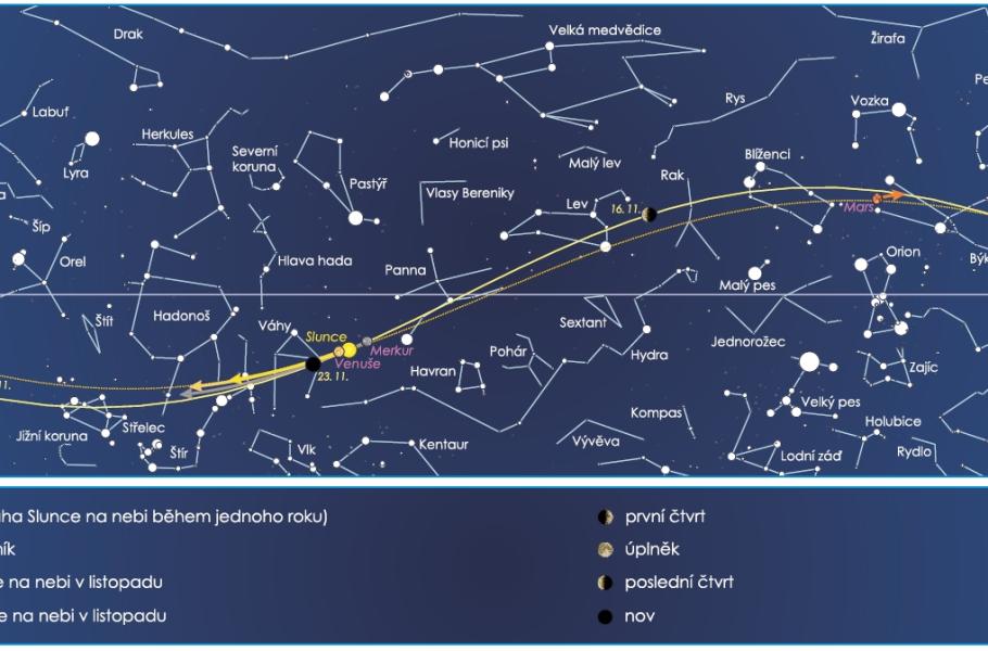 V první polovině měsíce se Slunce nachází ve znamení Štíra, 22. listopadu v 9:20 SEČ vstupuje Slunce do znamení Střelce