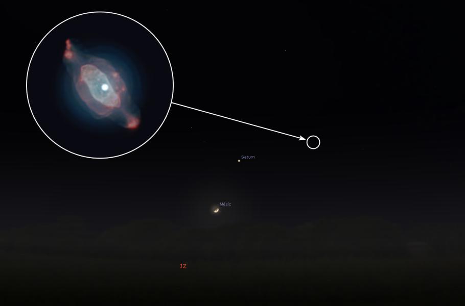 Kromě toho můžete přímo v jejím srdci zahlédnout drobnou hvězdu s 11,5 mag. Jedná se o bílého trpaslíka, velmi husté a horké jádro nepříliš hmotné stálice, která odvrhla svou vnější obálku do mezihvězdného prostoru. Zmíněná látka pak dala vzniknout mlhovině. Astronomové zjistili, že jde o komplikovanou soustavu řídkých „bublin“, jež se rychle rozpínají do okolí. Zahrnují přitom i několik dílčích zhustků a výtrysků, které vytvářejí dojem Saturnových prstenců. Plynný materiál lze pozorovat díky tomu, že ho budí k záření intenzivní ultrafialové světlo bílého trpaslíka.
