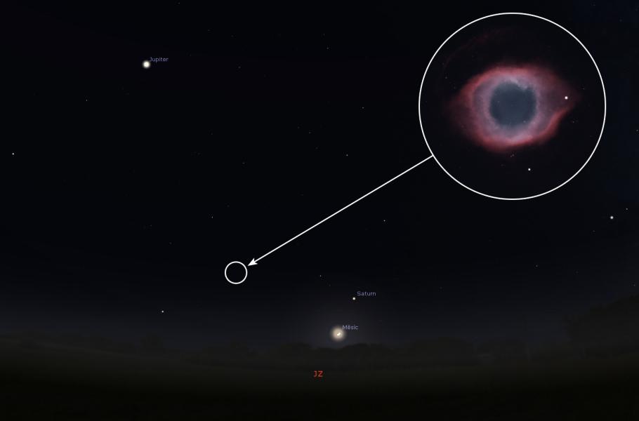 Hned v prvních listopadových dnech propluje noční oblohou nedaleko Saturnu a Jupitera dorůstající srpek Měsíce. Na své cestě projde i přes souhvězdí Vodnáře, nacházející se na nebi přímo mezi zmíněnými plynnými obry. Ve druhé polovině listopadu, až se náš souputník od Vodnáře dostatečně vzdálí a nebude oslňovat, se zkuste k souhvězdí vrátit s dalekohledem. Odmění vás pohledná kulová hvězdokupa a dvojice poměrně jasných planetárních mlhovin, z nichž jedna dostala přezdívku Saturn.