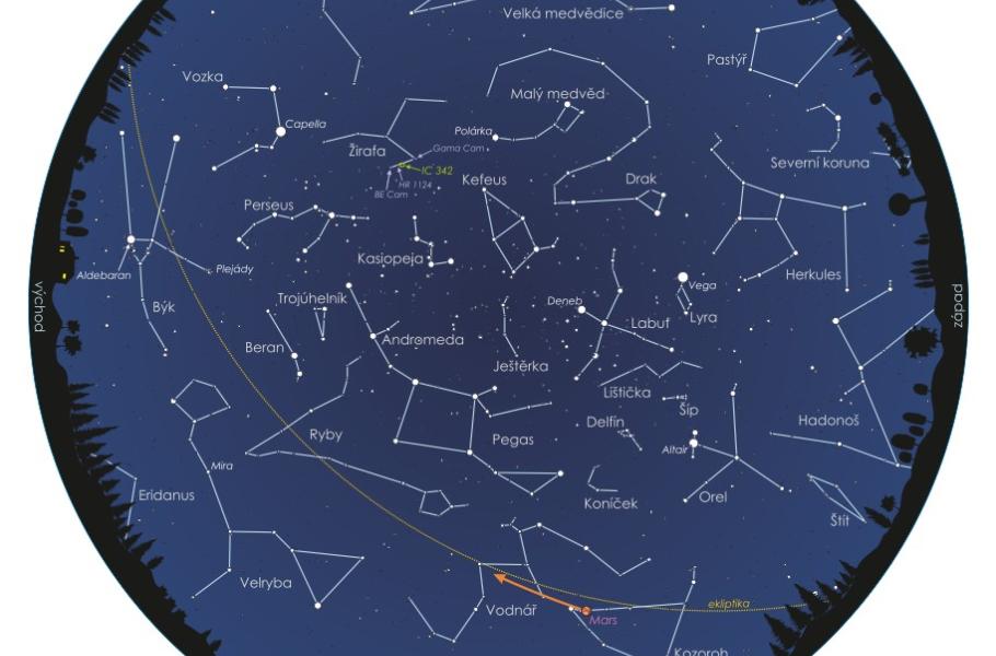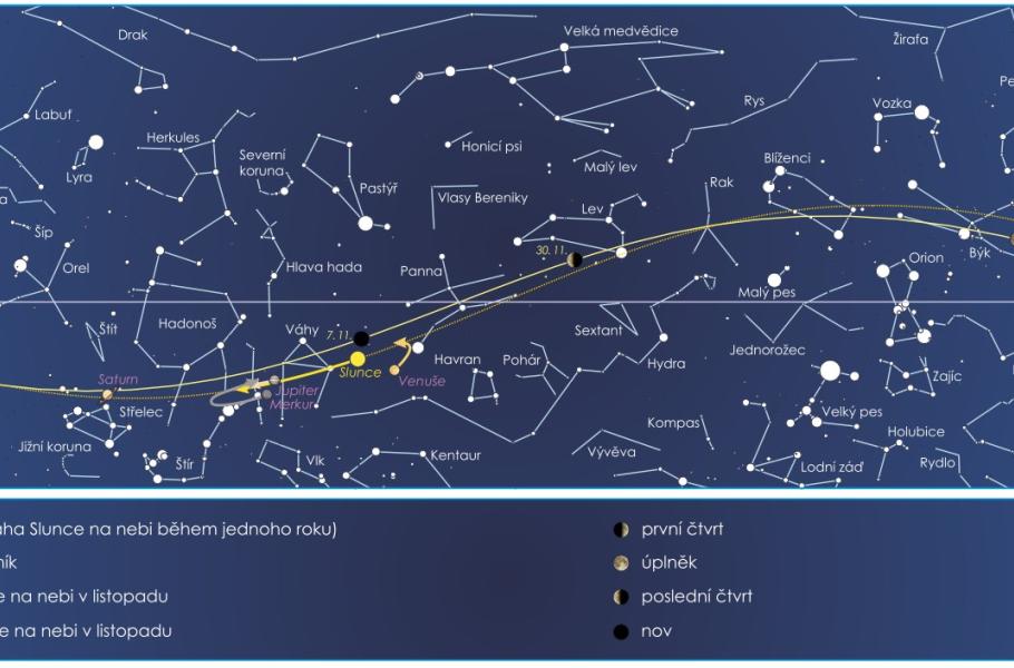 Skoupé na planety, přesně takové je letošní listopadové nebe po setmění. Z nápadných oběžnic je totiž k vidění pouze Saturn v souhvězdí Střelce a Mars putující z Kozoroha do Vodnáře. Prstencem opásaný Saturn zahlédneme jen zvečera, nízko nad jihozápadem. Déle tak nad obzorem setrvá pouze naoranžovělý Mars, i ten však zapadne ještě před půlnocí. Ve druhé polovině měsíce obohatí výčet planet pozorovatelných očima zářivá Venuše, která se začne objevovat krátce před východem Slunce nad jihovýchodním horizontem, v souhvězdí Panny.