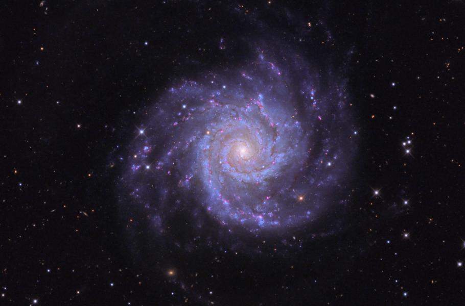 Třetí skok vás zavede na jih, do souhvězdí Ryb, bude však ze všech nejnáročnější. Na jeho konci totiž čeká jeden z nejobtížněji pozorovatelných objektů slavného Messierova katalogu: Spirální galaxie M74 či NGC 628 má jasnost jen 9,5 mag, a tu plošnou dokonce ještě o 4,5 mag menší! Abyste ji tedy zahlédli, připravte si dalekohled s objektivem o průměru alespoň 50 mm a použijte malé zvětšení, díky němuž se galaxie snáz oddělí od hvězdného pozadí.