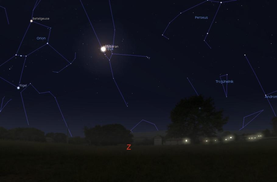 Další zákryt zpestří samotný závěr roku, netradiční silvestrovské oslavy však nečekejte – naopak si budete muset přivstat. K úkazu totiž dojde 31. prosince na ranním nebi vysoko nad jihozápadem a hvězdou, která dočasně zmizí z oblohy, bude opět Aldebaran. Stane se tak ve 2:25 SEČ u levého středního okraje Měsíce, ale už ve 3:09 se stálice objeví u dolního okraje měsíčního disku. Dodejme, že pro pozorovatele napříč Českou republikou se mohou časové údaje začátku a konce zákrytu o pár minut lišit v závislosti na jejich zeměpisné poloze.