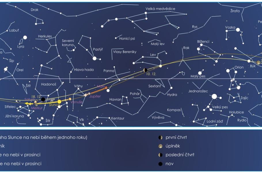 Vžádné jiné části roku nezapadá Slunce tak brzy jako v prosinci. Těsně nad obzorem jej zastihneme již před čtvrtou hodinou odpolední. S pozorováním jiskřivých hvězd mihotajících se v chladném zimním vzduchu tak můžeme začít ještě před večeří. Pro jasné planety to však neplatí: Na noční obloze je nespatříme a musíme si na ně počkat až do ranních hodin.