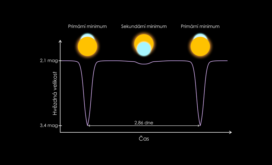 Hvězdná dvojice Algolu obíhá kolem společného těžiště, přičemž jednou za 2,86 dne pozorujeme přechod větší a méně svítivé složky (na ilustraci oranžová) přes složku svítivější, avšak menší (modrá). Nastává tzv. primární minimum, viditelné i pouhýma očima. V opačné situaci dochází k sekundárnímu minimu, s méně výrazným poklesem jasnosti. (ilustrace: Jan Píšala)