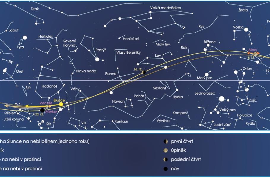 - Venuše – viditelná na sklonku prosince za soumraku nízko nad jihozápadem