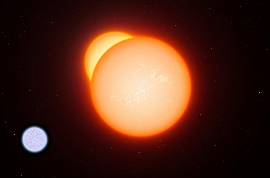 Základ Algolova systému, vzdáleného devadesát světelných roků, tvoří velmi těsná spektroskopická dvojhvězda: Stálici hlavní posloupnosti třikrát hmotnější než Slunce doprovází ve vzdálenosti pouhých devíti milionů kilometrů podobr s 0,7 sluneční hmotnosti. Zmíněnou dvojici pak jednou za 681 dní obkrouží ještě třetí hvězda, mírně hmotnější než Slunce. (ilustrace: ESO, L. Calçada, CC BY-SA 4.0)