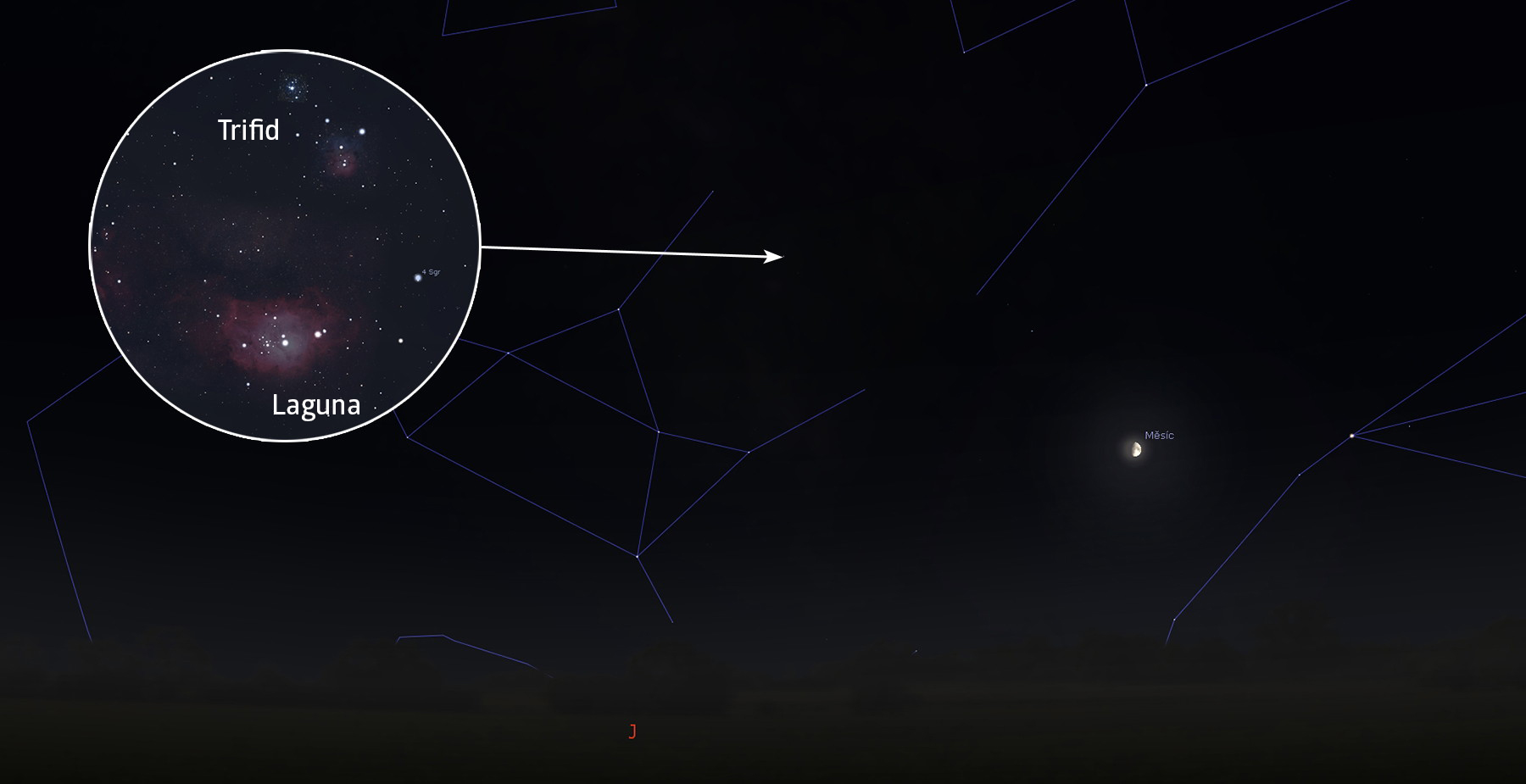 Ze všeho nejdřív prozkoumejte Lagunu neboli M8, jednu z nejhezčích emisních mlhovin, jaké tuzemská noční obloha nabízí. Na světlém letním nebi ji spatříte i pouhýma očima, přičemž se bude podobat jasnému „útržku“ Mléčné dráhy. Z něj se pak při pozornějším pohledu vyklube oválná skvrna s jasností asi 4,5 mag a s úhlovým průměrem přibližně 1°. Najdete ji snadno: Stačí se od hvězdy třetí velikosti Gama Sagittarii vydat 6° na sever mezi stálice 1 a 4 Sagittarii, dosahující zhruba 5 mag.